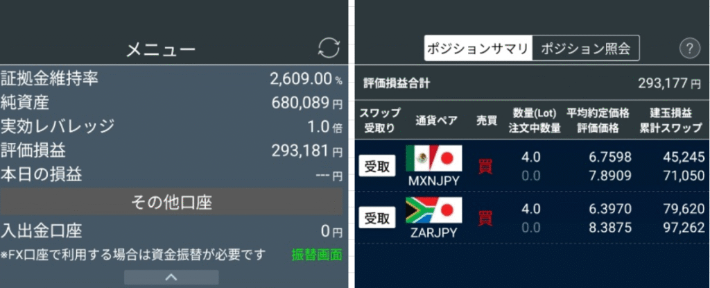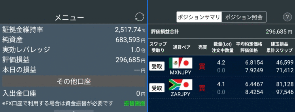 - 初回である今回はレバレッジ1倍以上の資金がFX口座にあるのでランド1000通貨、ペソ2000通貨を再投資しました(1000通貨=0.1ロット)