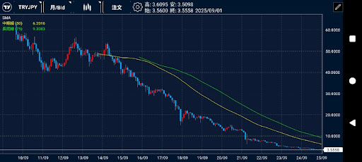 こちらがLITEFXのアプリで見たトルコリラのチャートです。2010年の一番古い時期からずっと右肩下がりで値段がさがりつづけています。